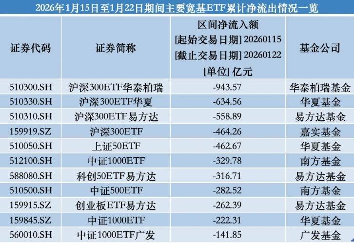 在1月15日8只宽基ETF遭创记录资金流出后,滂湃新闻记者据Wind数据统计,1月15日至1月22日历间,全商场1315只股票型ETF(含跨境ETF)累计净流出额已高达4071.21亿元。