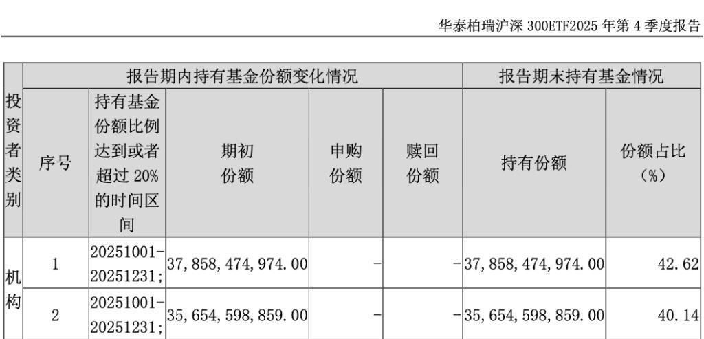 以华泰柏瑞沪深300ETF为例,其2025年四季报炫夸,位列前两大握有东说念主的“机构1”与“机构2”分离握有378.58亿份和356.55亿份,两者整个握有735.13亿份。该基金2025年中期敷陈曾明确表现,前两大握有东说念主恰是中央汇金钞票处罚有限职守公司(下称“汇金资管”)与中央汇金投资有限职守公司(下称“中央汇金”),并与2025年四季报的握有份额迷漫一致。