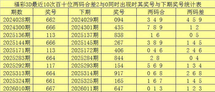 从以上统计不错看出,百十位两码合差2与0同期出现之后其下期两码合差推崇最热的4个永别为:1246,本期百十位两码合差不错参考这四码中的数据。