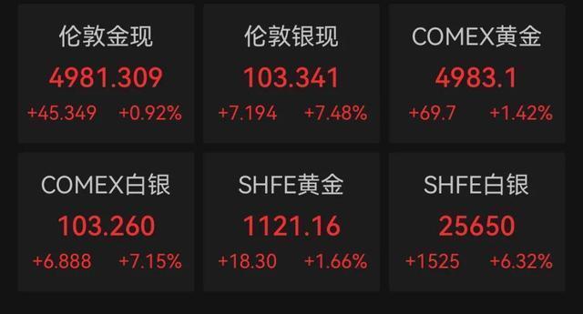 海外贵金属期货广大收涨,COMEX黄金期货涨1.42%报4983.10好意思元/盎司,本周累计高潮8.44%,COMEX白银期货涨7.15%报103.26好意思元/盎司,初次杰出100好意思元关隘立异高,本周累计高潮16.63%。现货白银也认真毁坏100好意思元/盎司关隘。