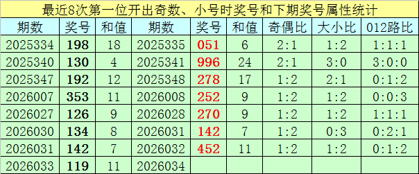 前7表率一位号码开荒谬数、小 号时奖号永诀为:198、130、192、353、126、134、142,其中奇偶总比例为13:8,有1期奇偶比与上期奇偶比一样;号码大小总比例为5:16,有3期奖号大小比与上期大小比一样;