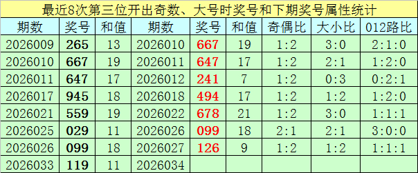 前7表率三位号码开荒谬数、大号时奖号永诀为:265、667、647、945、559、029、099,其中奇偶总比例为11:10,有1期奇偶比与上期奇偶比一样;号码大小总比例为15:6,有1期奖号大小比与上期大小比一样;